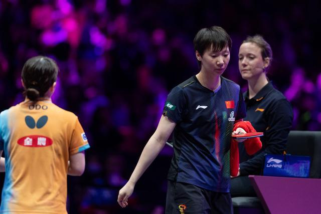 第三局,王曼昱0:3落后,马琳指导叫下暂停。暂停归来,王曼昱依旧没能找回状态,以3:11再输一局。